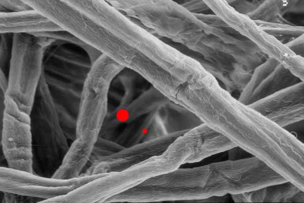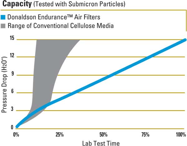 The nanofiber technology causes submicron contaminants to be held on the surface layer of smaller fibers. This filtration characteristic is only possible with this new type of air filtration technology. In on-highway applications, where the contaminant is primarily submicron in size, Donaldson Blue filters cause less restriction than conventional filters with cellulose media. The